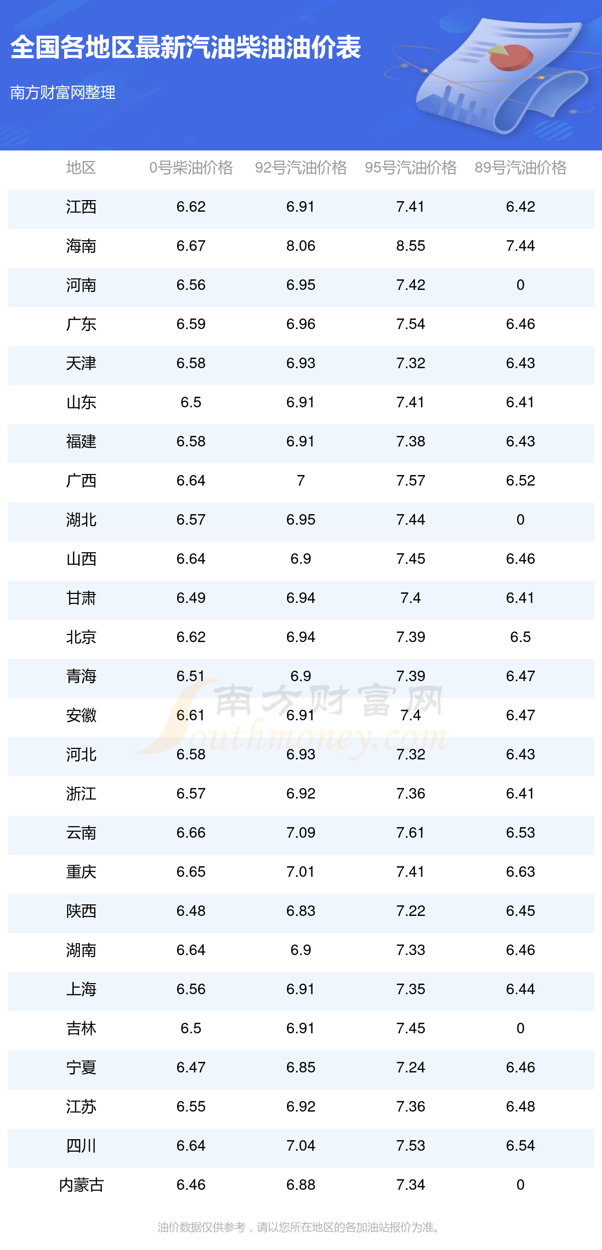 油價數(shù)據(jù)僅供參考,請以您所在地區(qū)的加油站報價為準。南方財富網(wǎng)發(fā)布此信息的目的在于傳播更多信息,對使用該油價信息所導致的結果概不承擔任何責任。