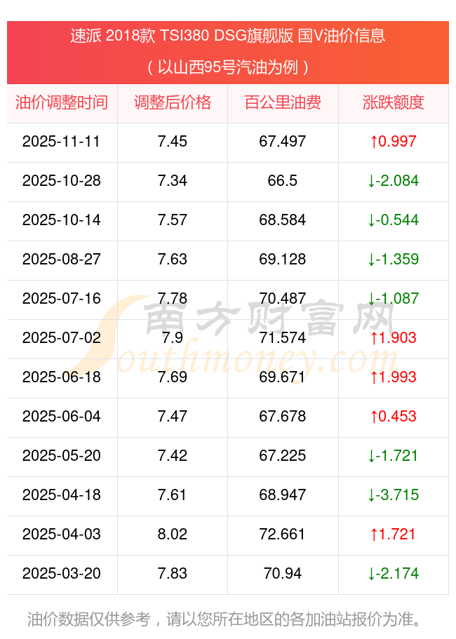 依照11月11日95號(hào)汽油最新調(diào)整價(jià)格7.45元/升來計(jì)算(以山西為例),該車型百公里的平均油費(fèi)是67.497元,依照上一輪10月28日調(diào)整價(jià)格7.34元/升來計(jì)算,百公里的平均油費(fèi)是66.5元,對(duì)比上一輪多花0.997元,下一輪的油價(jià)調(diào)整時(shí)間11月24日24時(shí)。