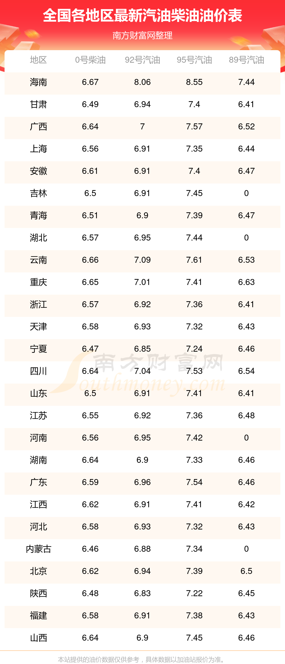 2025年11月15日全國各地汽油價(jià)格一覽表
