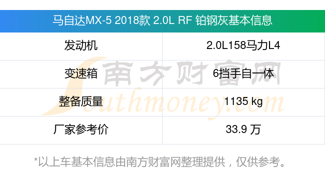 馬自達(dá)MX-5 2018款 2.0L RF 鉑鋼灰搭載了一臺(tái)2.0L158馬力L4自然吸氣發(fā)動(dòng)機(jī),采用6擋手自一體自動(dòng)檔變速箱,常規(guī)整備質(zhì)量1135kg,廠家參考價(jià)33.9萬元。