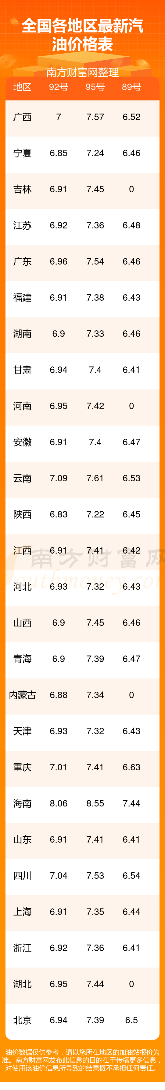 油價數(shù)據(jù)僅供參考,請以您所在地區(qū)的加油站報價為準。南方財富網(wǎng)發(fā)布此信息的目的在于傳播更多信息,對使用該油價信息所導致的結(jié)果概不承擔任何責任。