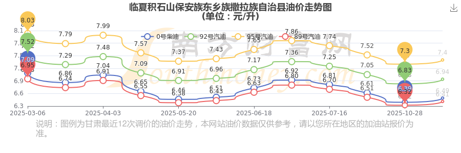 臨夏積石山保安族東鄉(xiāng)族撒拉族自治縣11月15日0號柴油歷史油價(jià)調(diào)整走勢圖