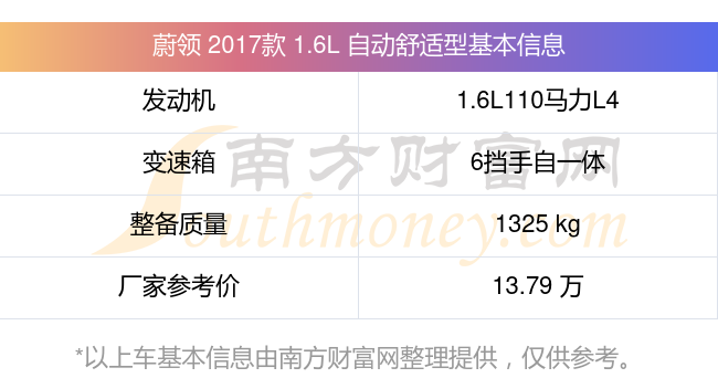 在動力方面,蔚領(lǐng) 2017款 1.6L 自動舒適型搭載的是一臺1.6L110馬力L4自然吸氣發(fā)動機(jī),匹配6擋手自一體自動檔變速箱,燃料形式為汽油,常規(guī)整備質(zhì)量1325kg,廠家參考價13.79萬元。