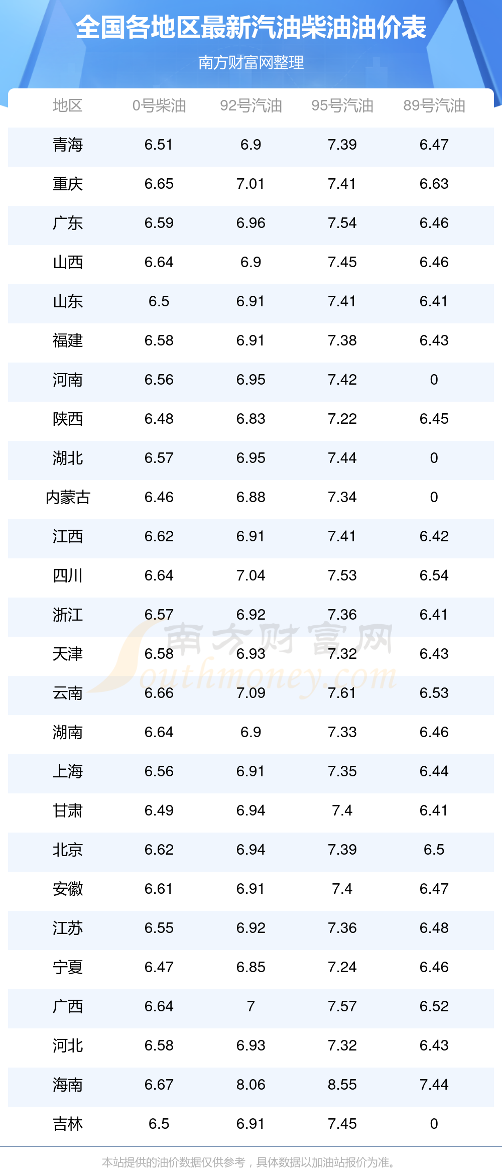 以上油價(jià)信息是當(dāng)前市場(chǎng)上最新油價(jià)信息,油價(jià)數(shù)據(jù)僅供參考,實(shí)際在售油價(jià)可能有小幅偏差,請(qǐng)以您所在地區(qū)的加油站實(shí)際售價(jià)為準(zhǔn)。