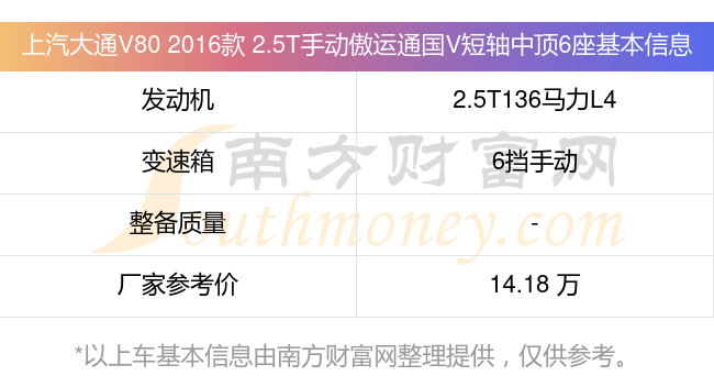 在動(dòng)力上,上汽大通V80 2016款 2.5T手動(dòng)傲運(yùn)通國(guó)V短軸中頂6座配備的是一臺(tái)2.5T136馬力L4渦輪增壓發(fā)動(dòng)機(jī),匹配的是6擋手動(dòng)擋變速箱,燃料形式為柴油,廠家參考價(jià)14.18萬(wàn)元。