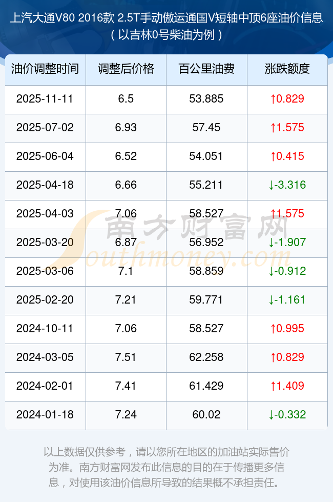 依照11月11日0號(hào)柴油最新調(diào)整價(jià)格6.5元/升來(lái)計(jì)算(以吉林為例),該車型百公里的平均油費(fèi)是53.885元,依照上一輪7月2日調(diào)整價(jià)格6.4元/升來(lái)計(jì)算,百公里的平均油費(fèi)是53.056元,對(duì)比上一輪多花0.829元,下一輪的油價(jià)調(diào)整時(shí)間11月24日24時(shí)。