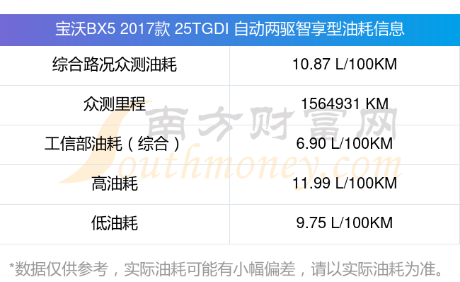 根據(jù)多位車主實測得出數(shù)據(jù),該車型低油耗為9.75升每百公里,高油耗為11.99升每百公里,綜合路況眾測油耗為10.87升每百公里,工信部綜合油耗為6.90升每百公里。