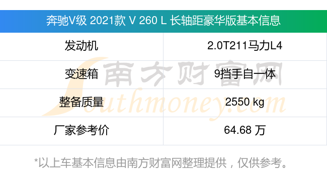 奔馳V級(jí) 2021款 V 260 L 長(zhǎng)軸距豪華版動(dòng)力上配備的是一臺(tái)2.0T211馬力L4渦輪增壓發(fā)動(dòng)機(jī),匹配的是9擋手自一體自動(dòng)檔變速箱,燃料形式為汽油,常規(guī)整備質(zhì)量2550kg,廠家參考價(jià)64.68萬(wàn)元。