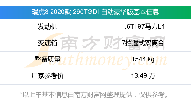 瑞虎8 2020款 290TGDI 自動豪華版動力方面,搭載的是一臺1.6T197馬力L4渦輪增壓發(fā)動機,匹配7擋濕式雙離合自動檔變速箱,燃料形式為汽油,常規(guī)整備質(zhì)量1544kg,廠家參考價13.49萬元。