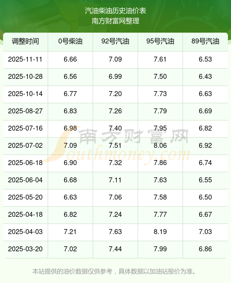 11月15日云南大理95號(hào)汽油的最新價(jià)格(11月11日調(diào)整后的價(jià)格):7.61元/升,相對(duì)上次調(diào)整增了0.11元。下一輪油價(jià)調(diào)整時(shí)間11月24日24時(shí),距離現(xiàn)在還有9.35天。