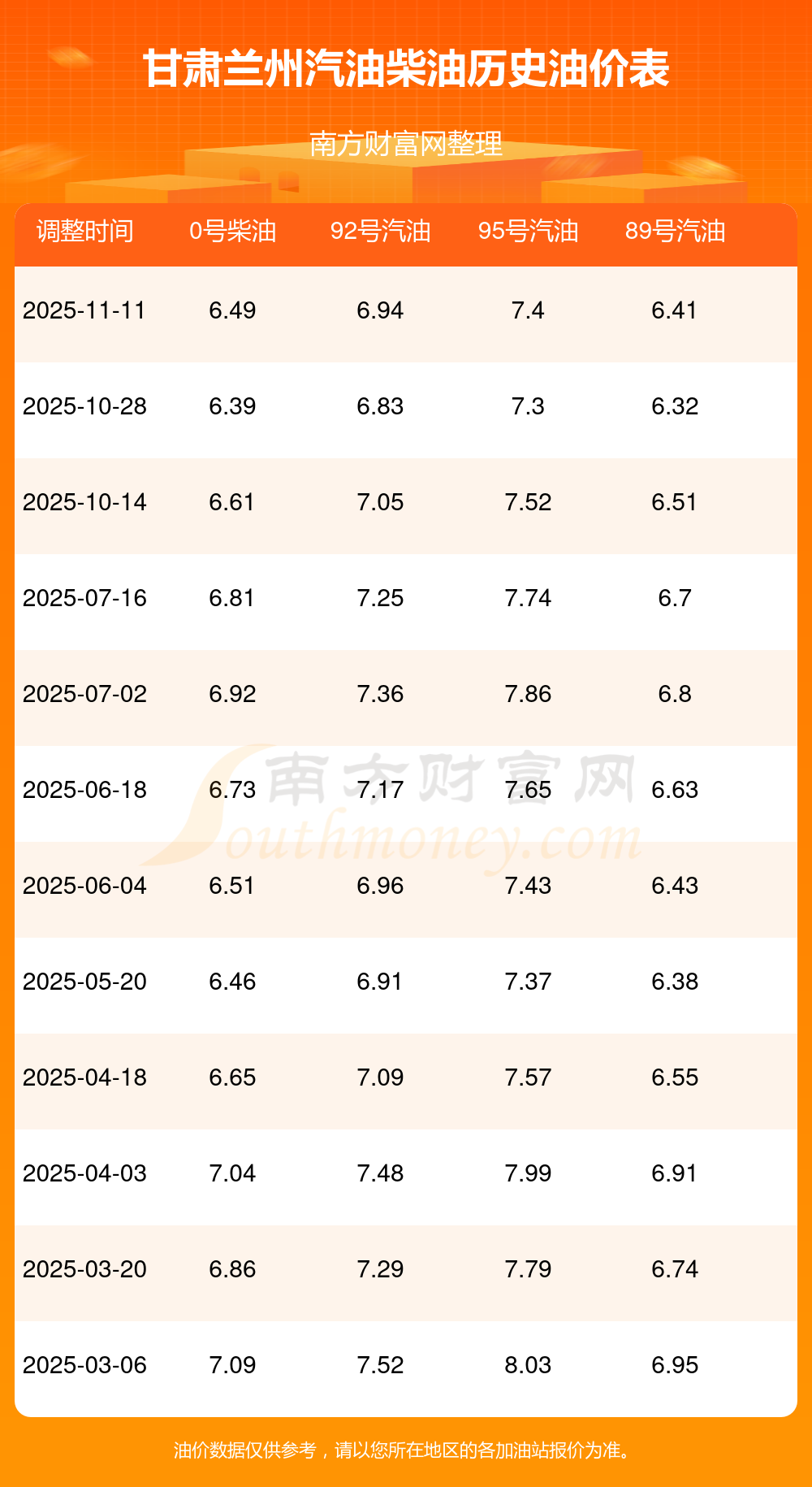 最近一次油價調(diào)整最新價格表