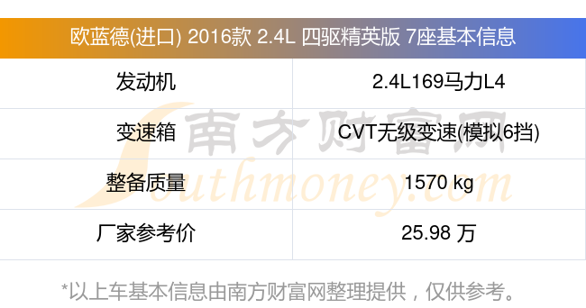 在動力方面,歐藍德(進口) 2016款 2.4L 四驅(qū)精英版 7座搭載的是一臺2.4L169馬力L4自然吸氣發(fā)動機,匹配CVT無級變速(模擬6擋)自動檔變速箱,燃料形式為汽油,常規(guī)整備質(zhì)量1570kg,廠家參考價25.98萬元。
