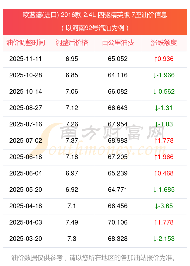 根據(jù)11月11日92號汽油最新調(diào)整價格6.95元/升來計算(以河南為例),該車型每百公里的平均油費是65.052元,上一輪10月28日調(diào)整價格6.85元每升來計算,每百公里的平均油費是64.116元,對比上一輪多花0.936元,下一輪的油價調(diào)整時間是11月24日24時。