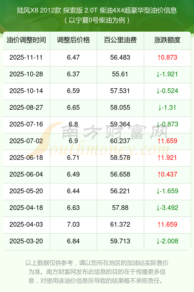 按照11月11日0號柴油最新調整價格6.47元/升來計算(以寧夏為例),該車型百公里平均油費為56.483元,按照上一輪10月28日調整價格6.37元/升來計算,百公里平均油費為55.61元,對比上一輪多花0.873元,下一輪油價調整時間為11月24日24時。
