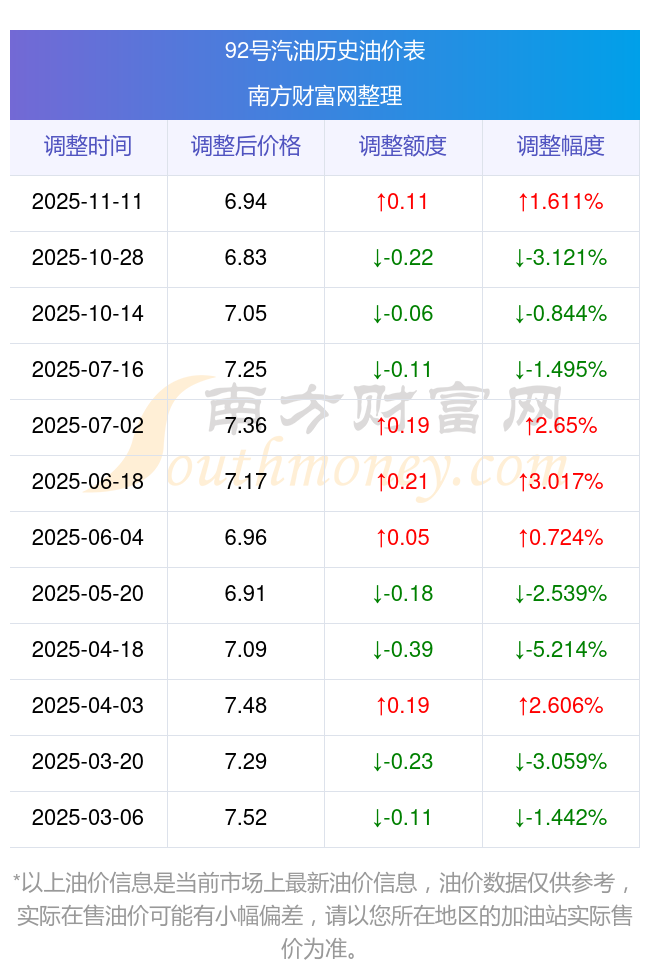 11月15日汽油、柴油價格是多少錢一升?11月11日調(diào)整后,92號汽油為6.94元,漲了0.11元,漲幅達1.61%;95號汽油為7.4元,漲了0.1元,漲幅達1.37%;89號汽油為6.41元,漲了0.09元,漲幅達1.42%;0號柴油為6.49元,漲了0.1元,漲幅達1.57%。下一輪油價調(diào)整時間11月24日24時,距離現(xiàn)在還有9.34天。