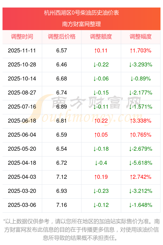 11月15日杭州西湖區(qū)0號柴油歷史油價調(diào)整一覽表