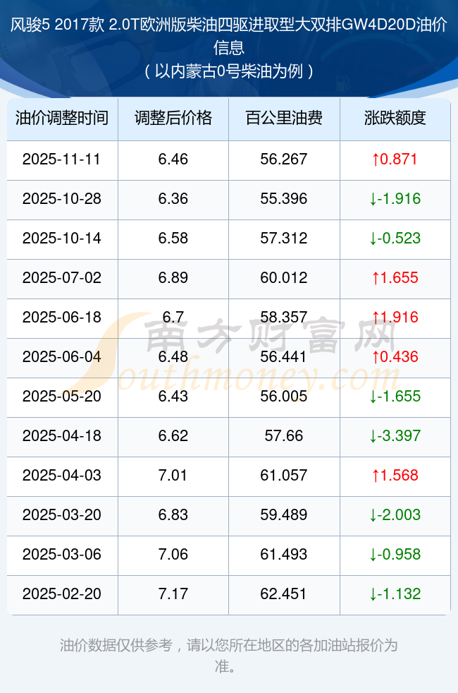 按11月11日0號柴油最新調(diào)整價格6.46元每升來計算(以內(nèi)蒙古為例),該車型百公里平均油費為56.267元,按上一輪10月28日調(diào)整價格6.36元每升來計算,百公里平均油費為55.396元,對比上一輪多花0.871元,下一輪油價調(diào)整時間為11月24日24時。