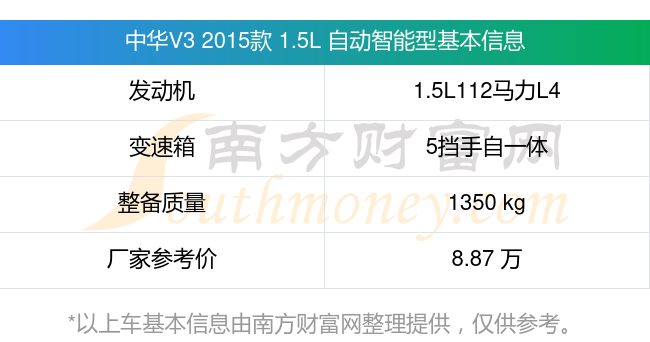 在動力上,中華V3 2015款 1.5L 自動智能型配備的是一臺1.5L112馬力L4自然吸氣發(fā)動機,匹配的是5擋手自一體自動檔變速箱,燃料形式為汽油,常規(guī)整備質(zhì)量1350kg,廠家參考價8.87萬元。