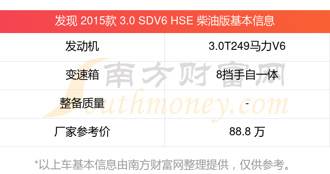 發(fā)現(xiàn) 2015款 3.0 SDV6 HSE 柴油版動力上搭載的是一臺3.0T249馬力V6雙渦輪增壓發(fā)動機,匹配8擋手自一體自動檔變速箱,燃料形式為柴油,廠家參考價88.8萬元。