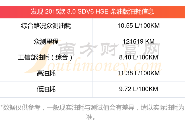 根據(jù)多位車主實測得出數(shù)據(jù),該車型低油耗為9.72升/百公里,高油耗為11.38升/百公里,綜合路況眾測油耗為10.55升/百公里,工信部綜合油耗為8.40升/百公里。