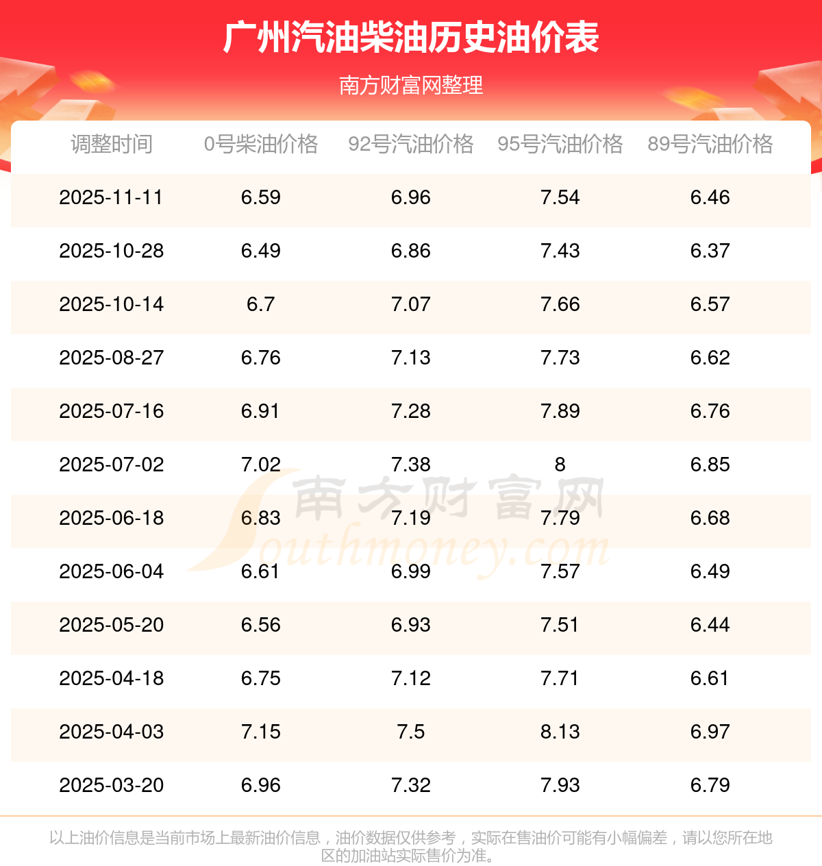 11月15日的廣州汽油、柴油每升最新價格(調整時間為11月11日):92號汽油為6.96元,升了0.1元,升幅達1.46%;95號汽油為7.54元,升了0.11元,升幅達1.48%;89號汽油為6.46元,升了0.09元,升幅達1.41%;0號柴油為6.59元,升了0.1元,升幅達1.54%。