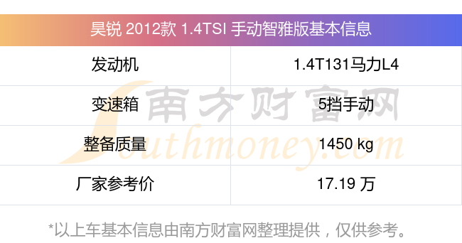昊銳 2012款 1.4TSI 手動(dòng)智雅版搭載了一臺(tái)1.4T131馬力L4渦輪增壓發(fā)動(dòng)機(jī),采用5擋手動(dòng)擋變速箱,常規(guī)整備質(zhì)量1450kg,廠家參考價(jià)17.19萬元。