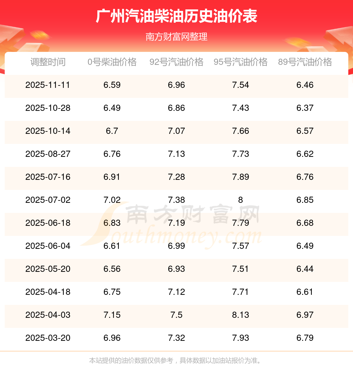 廣州2025年汽油價格一覽表