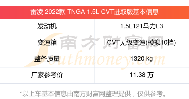 在動力方面,雷凌 2022款 TNGA 1.5L CVT進(jìn)取版搭載的是一臺1.5L121馬力L3自然吸氣發(fā)動機(jī),匹配CVT無級變速(模擬10擋)自動檔變速箱,燃料形式為汽油,常規(guī)整備質(zhì)量1320kg,廠家參考價(jià)11.38萬元。