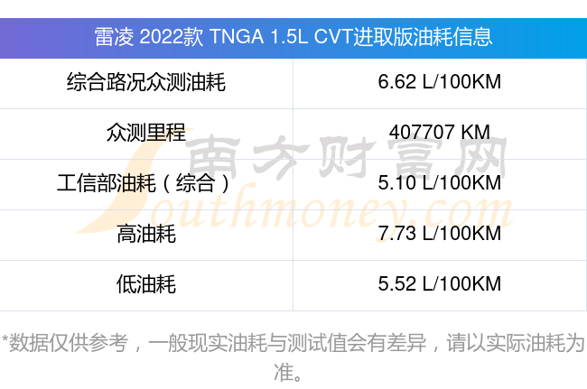 根據(jù)多位車主實(shí)測得出數(shù)據(jù),該車型低油耗為5.52升/百公里,高油耗為7.73升/百公里,綜合路況眾測油耗為6.62升/百公里,工信部綜合油耗為5.10升/百公里。