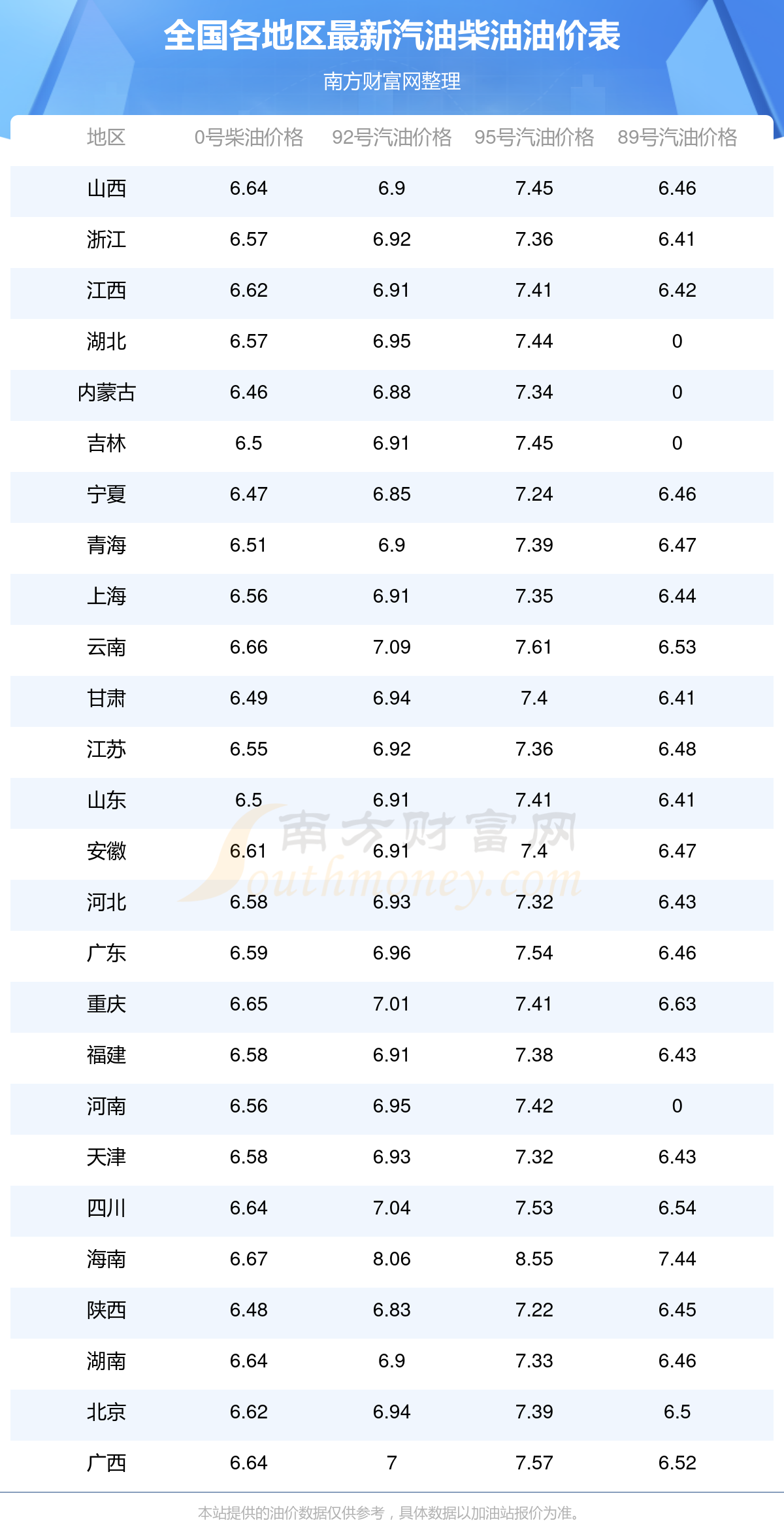 全國各地區(qū)最新油價表
