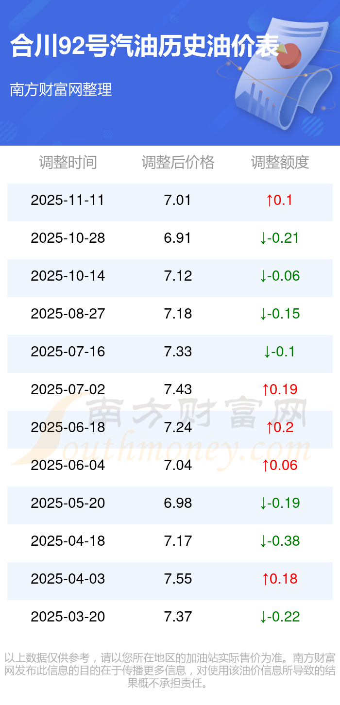 2025年92號(hào)汽油價(jià)格調(diào)整一覽表