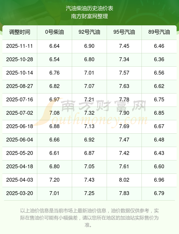 2025年汽油柴油油價(jià)調(diào)整一覽表