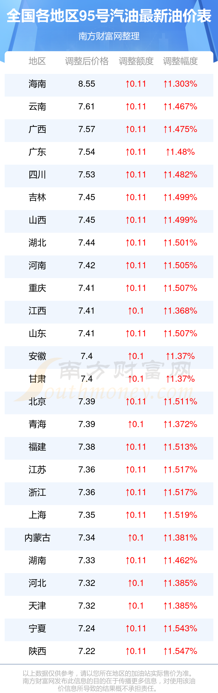 全國95號(hào)汽油最新平均價(jià)格為:7元每升,其中,最高為海南,價(jià)格為8.55元/升,最低為陜西,價(jià)格為7.22元/升。