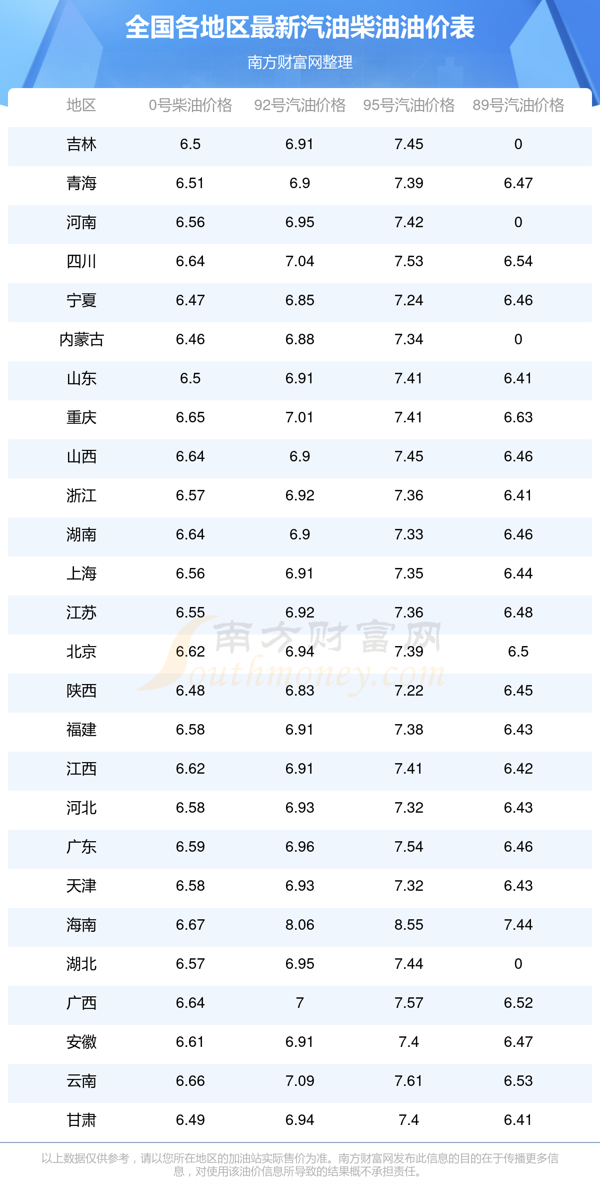 油價(jià)數(shù)據(jù)僅供參考,請(qǐng)以您所在地區(qū)的加油站報(bào)價(jià)為準(zhǔn)。南方財(cái)富網(wǎng)發(fā)布此信息的目的在于傳播更多信息,對(duì)使用該油價(jià)信息所導(dǎo)致的結(jié)果概不承擔(dān)任何責(zé)任。