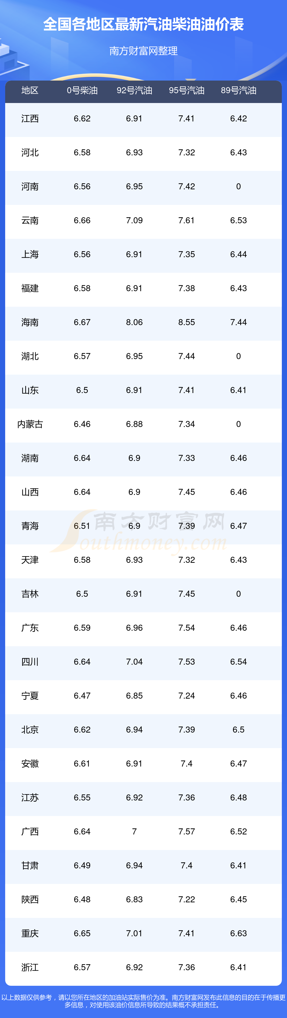 以上數(shù)據(jù)僅供參考,請以您所在地區(qū)的加油站實際售價為準。南方財富網(wǎng)發(fā)布此信息的目的在于傳播更多信息,對使用該油價信息所導致的結(jié)果概不承擔責任。