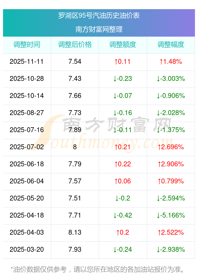 羅湖區(qū)95號(hào)汽油歷史油價(jià)一覽表