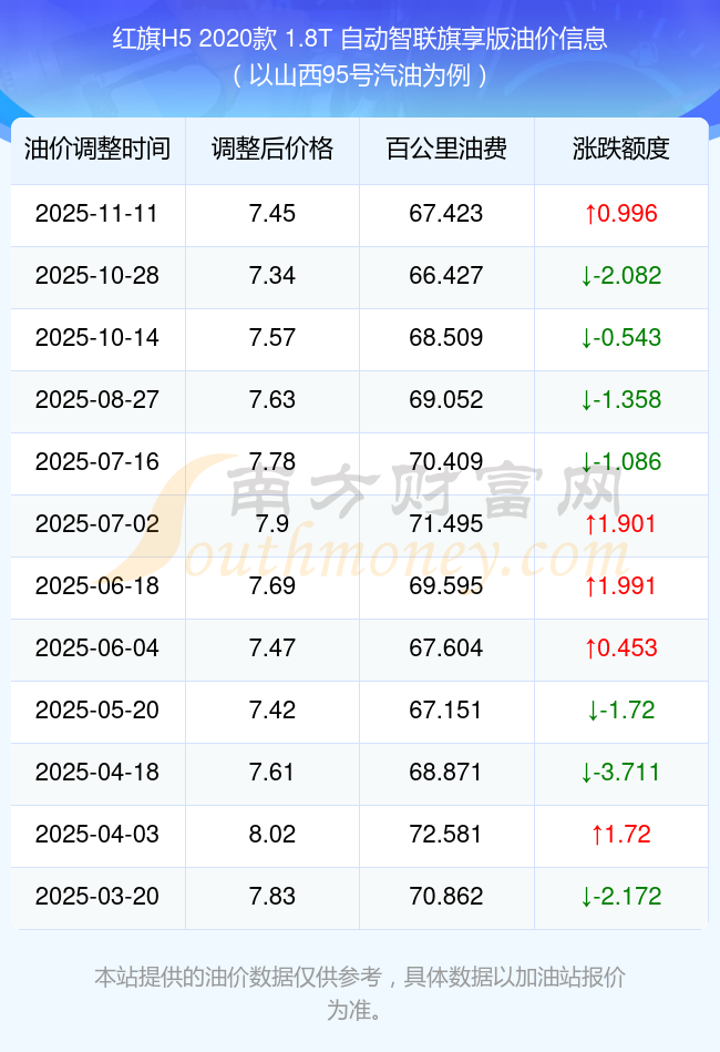 按照11月11日95號汽油最新調整價格7.45元/升來計算(以山西為例),該車型百公里平均油費為67.423元,按照上一輪10月28日調整價格7.34元/升來計算,百公里平均油費為66.427元,對比上一輪多花0.996元,下一輪油價調整時間為11月24日24時。