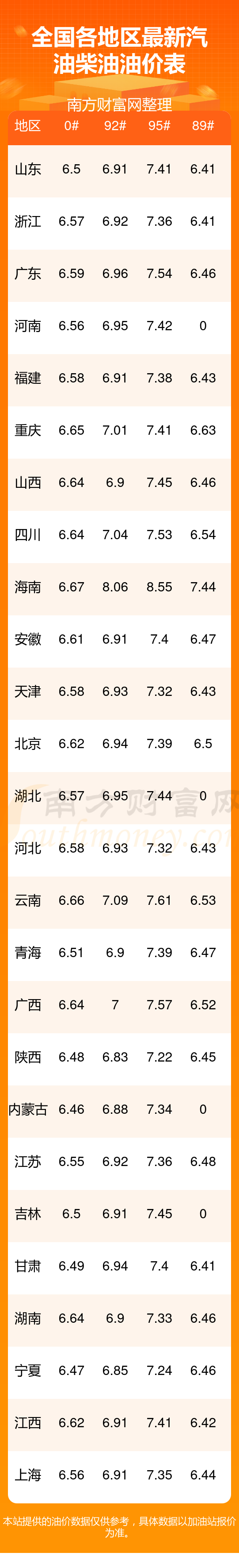 以上油價信息是當(dāng)前市場上最新油價信息,油價數(shù)據(jù)僅供參考,實際在售油價可能有小幅偏差,請以您所在地區(qū)的加油站實際售價為準(zhǔn)。