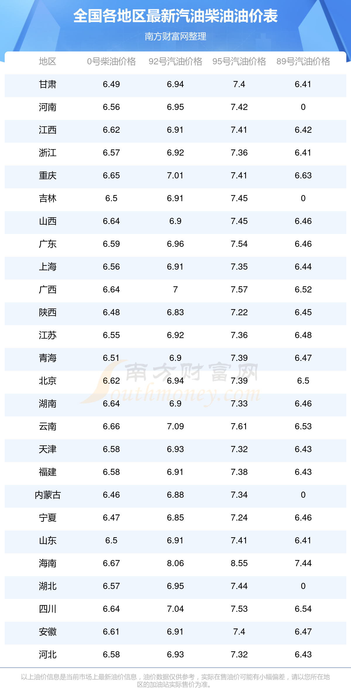 以上油價信息是當前市場上最新油價信息,油價數(shù)據(jù)僅供參考,實際在售油價可能有小幅偏差,請以您所在地區(qū)的加油站實際售價為準。