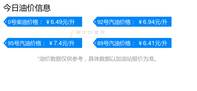 油價(jià)數(shù)據(jù)僅供參考,請(qǐng)以您所在地區(qū)的加油站報(bào)價(jià)為準(zhǔn)。南方財(cái)富網(wǎng)發(fā)布此信息的目的在于傳播更多信息,對(duì)使用該油價(jià)信息所導(dǎo)致的結(jié)果概不承擔(dān)任何責(zé)任。