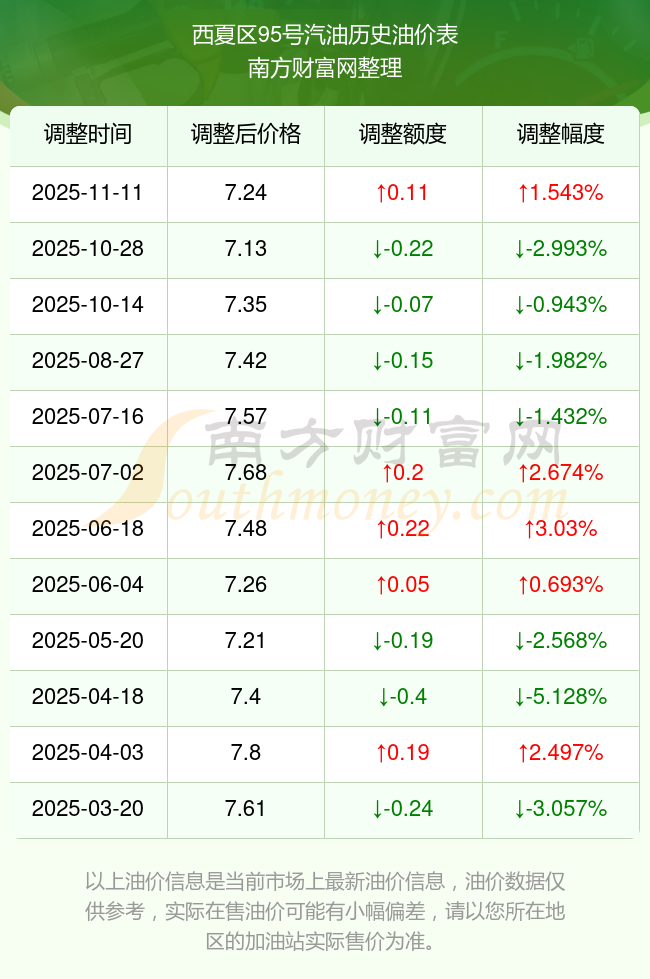 西夏區(qū)95號汽油11月15日的價格為7.24元/升,本次油價的調(diào)整時間為11月11日,對比上次油價調(diào)整時間10月28日的價格7.13元/升,共漲了0.11元,漲幅達(dá)1.543%。
