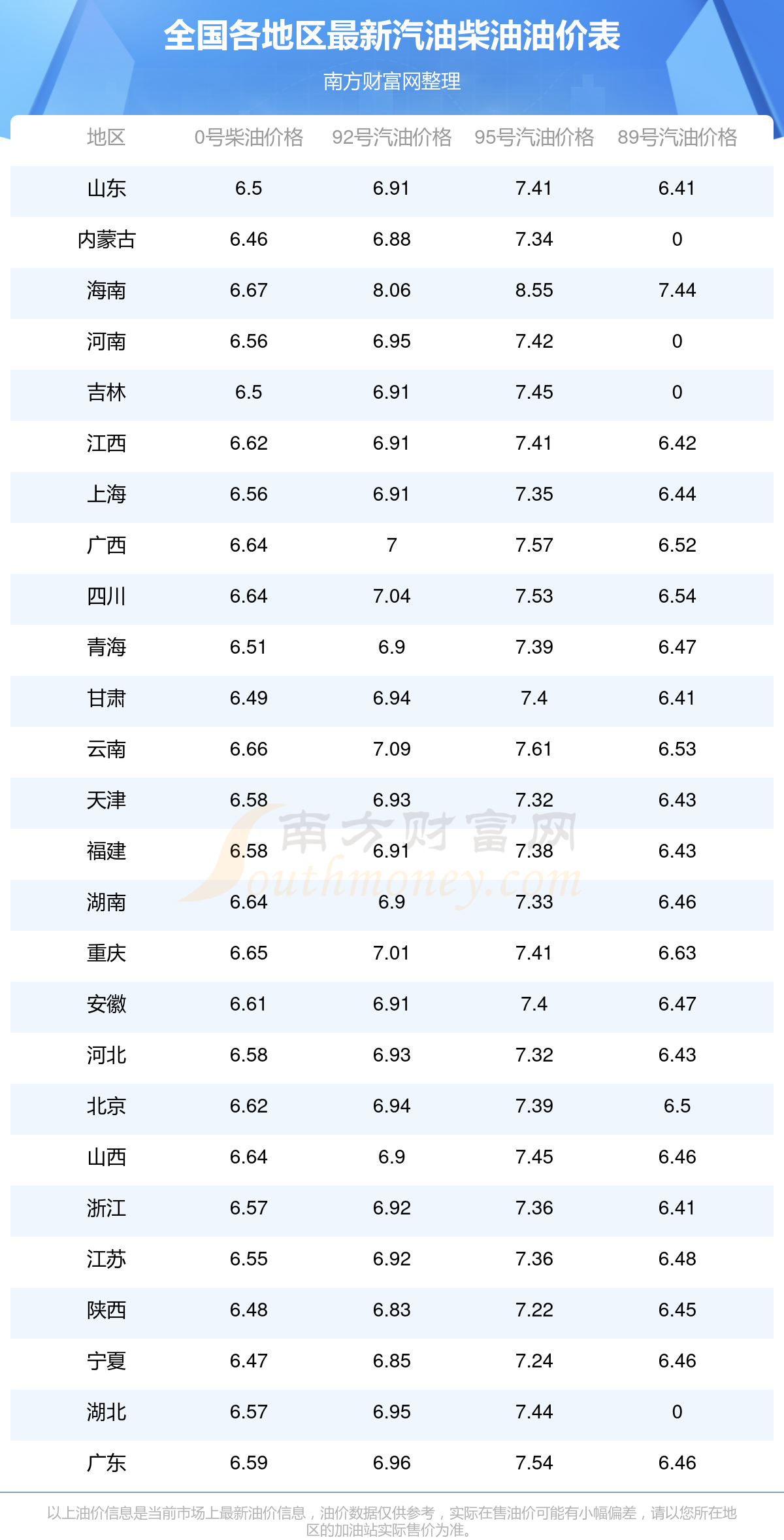 以上數(shù)據(jù)僅供參考,請以您所在地區(qū)的加油站實際售價為準。南方財富網(wǎng)發(fā)布此信息的目的在于傳播更多信息,對使用該油價信息所導(dǎo)致的結(jié)果概不承擔(dān)責(zé)任。