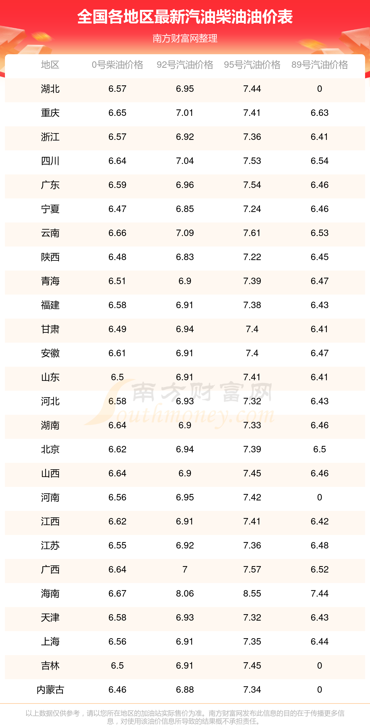 全國(guó)89號(hào)汽油最新平均價(jià)格為:7元每升,其中,最低為浙江,價(jià)格為6.41元/升,最高為海南,價(jià)格為7.44元/升。