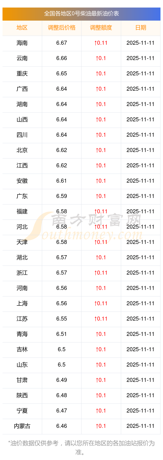 附:全國(guó)各地區(qū)0號(hào)柴油油價(jià)一覽表