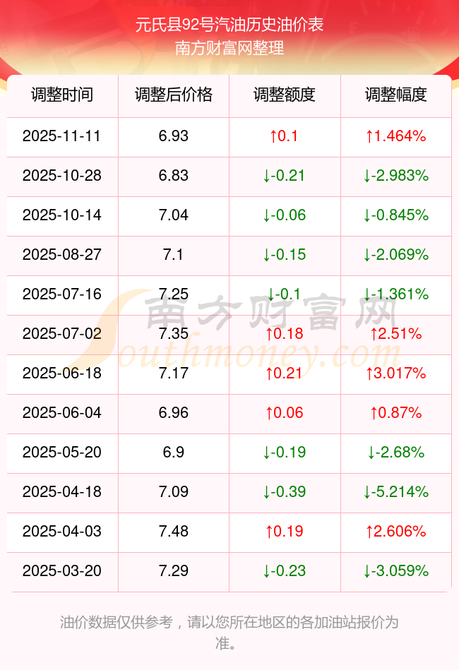 11月15日元氏縣92號(hào)汽油歷史油價(jià)一覽表