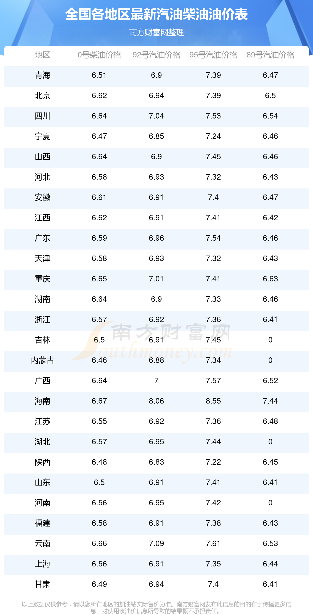 油價調(diào)整最新消息:油價最新調(diào)整時間為11月11日,全國92號汽油最新平均價格為:7元每升,其中,最低為陜西,價格為6.83元/升,最高為海南,價格為8.06元/升。全國95號汽油最新平均價格為:7元每升,其中,最低為陜西,價格為7.22元/升,最高為海南,價格為8.55元/升。全國0號柴油最新平均價格為:7元每升,其中,最低為內(nèi)蒙古,價格為6.46元/升,最高為海南,價格為6.67元/升。全國89號汽油最新平均價格為:7元每升,其中,最低為浙江,價格為6.41元/升,最高為海南,價格為7.44元/升。下一輪汽油價格調(diào)整時間11月24日24時,距離現(xiàn)在還有9.16天。