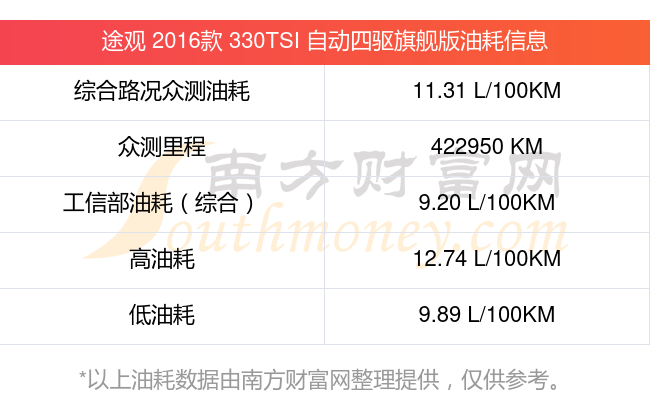 根據(jù)車主實測數(shù)據(jù),該車型低油耗為9.89升/百公里,高油耗為12.74升/百公里,綜合路況眾測油耗為11.31升/百公里,工信部綜合油耗為9.20升/百公里。
