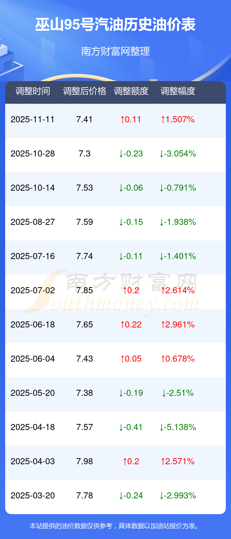 2025年95號(hào)汽油價(jià)格調(diào)整一覽表