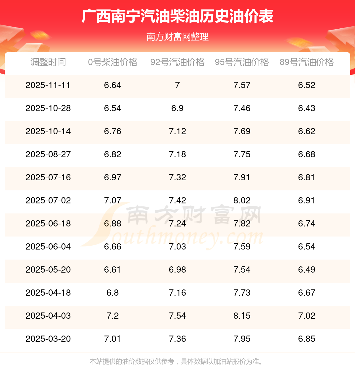 11月15日廣西南寧汽油柴油每升的價(jià)格為11月11日調(diào)整后的價(jià)格,具體如下:92號汽油7元;95號汽油7.57元;89號汽油6.52元;0號柴油6.64元。