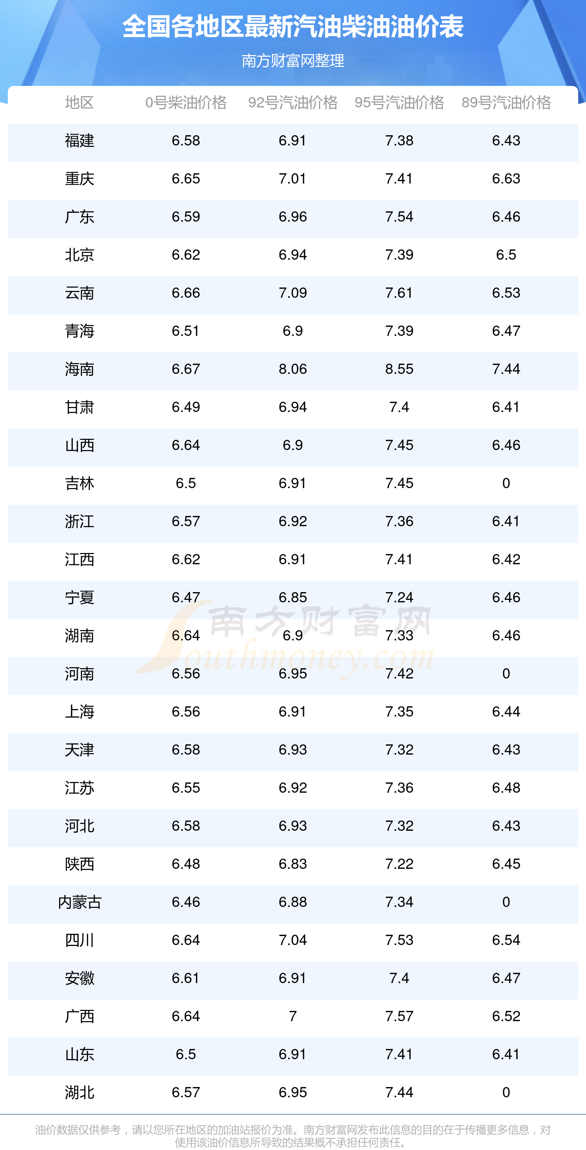 油價數(shù)據(jù)僅供參考,請以您所在地區(qū)的加油站報價為準。南方財富網(wǎng)發(fā)布此信息的目的在于傳播更多信息,對使用該油價信息所導(dǎo)致的結(jié)果概不承擔(dān)任何責(zé)任。
